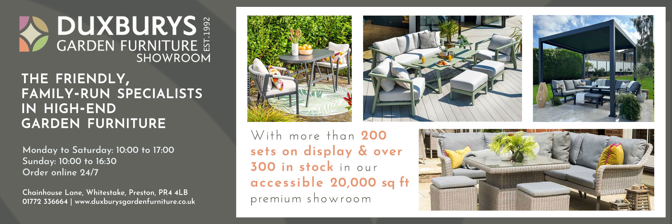 Duxburys Garden Furniture Showroom is just off the M6, M61 and M65 Preston.