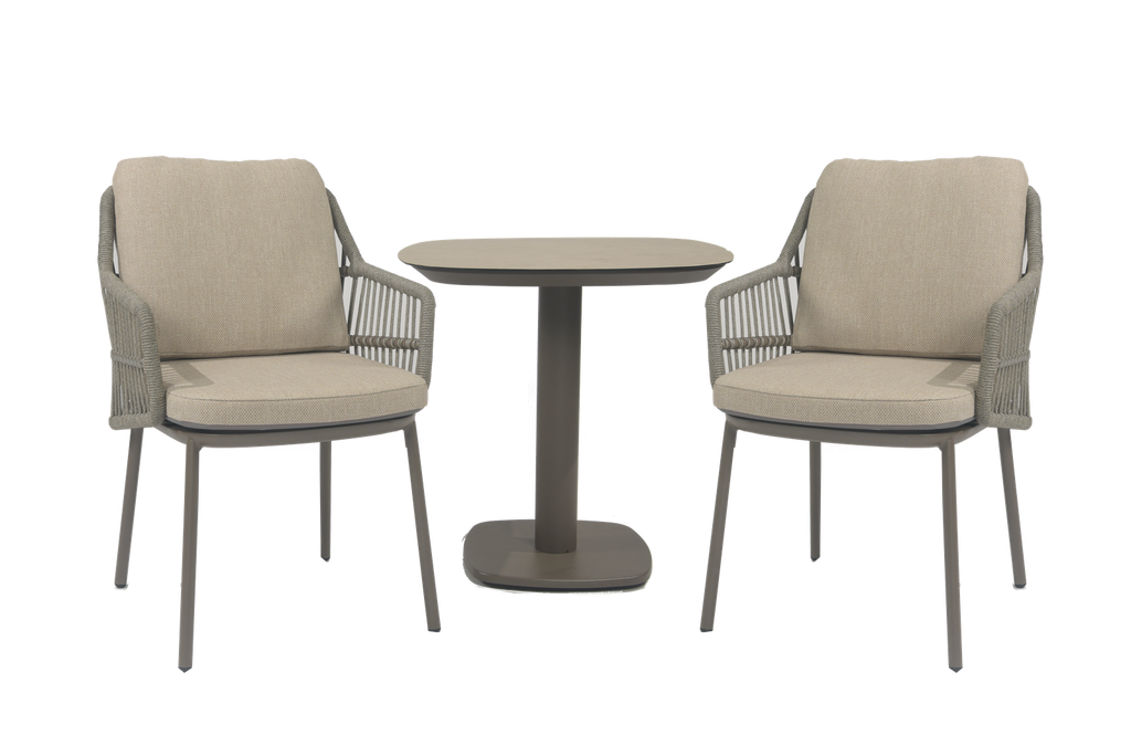 The Alicante Bistro Set with Latte Manolo Table in Terre brings luxury, comfort, and contemporary outdoor style together in the perfect two-seat arrangement.