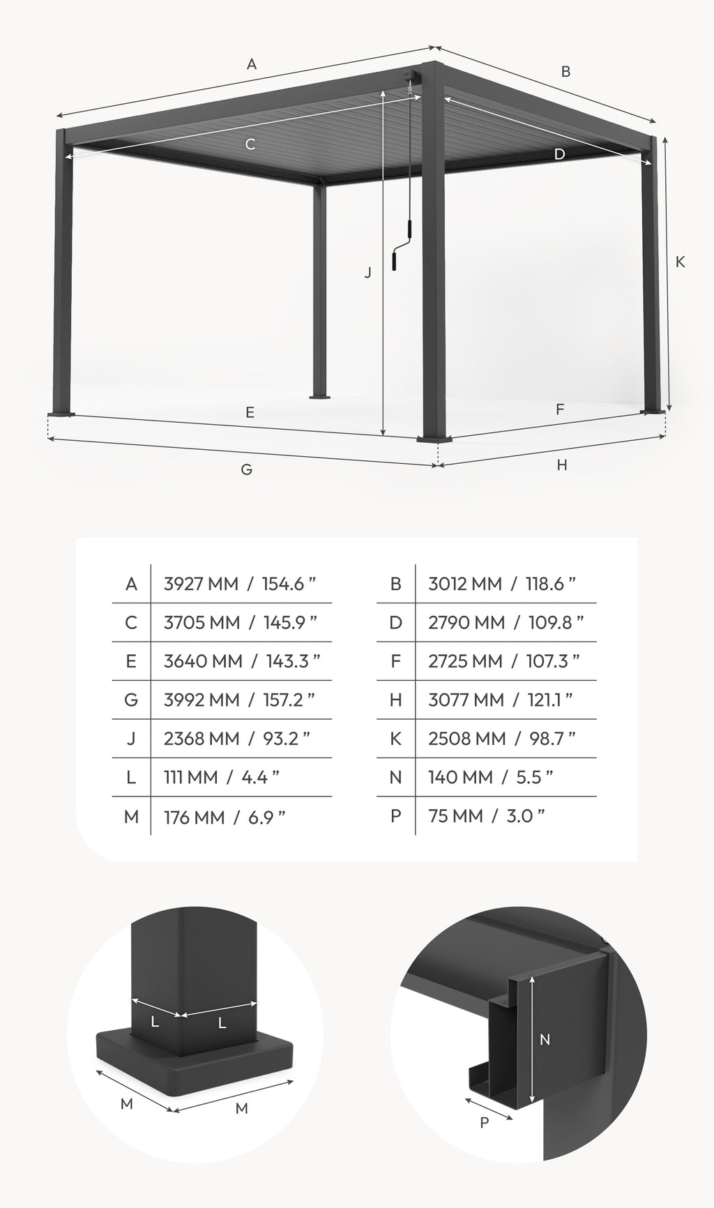 No need to manually remove rainwater. A clever drainage system channels water through the pergola’s frame and down through the legs, keeping your space dry and free from water runoff. Just check the gutters occasionally to remove debris and maintain peak performance.