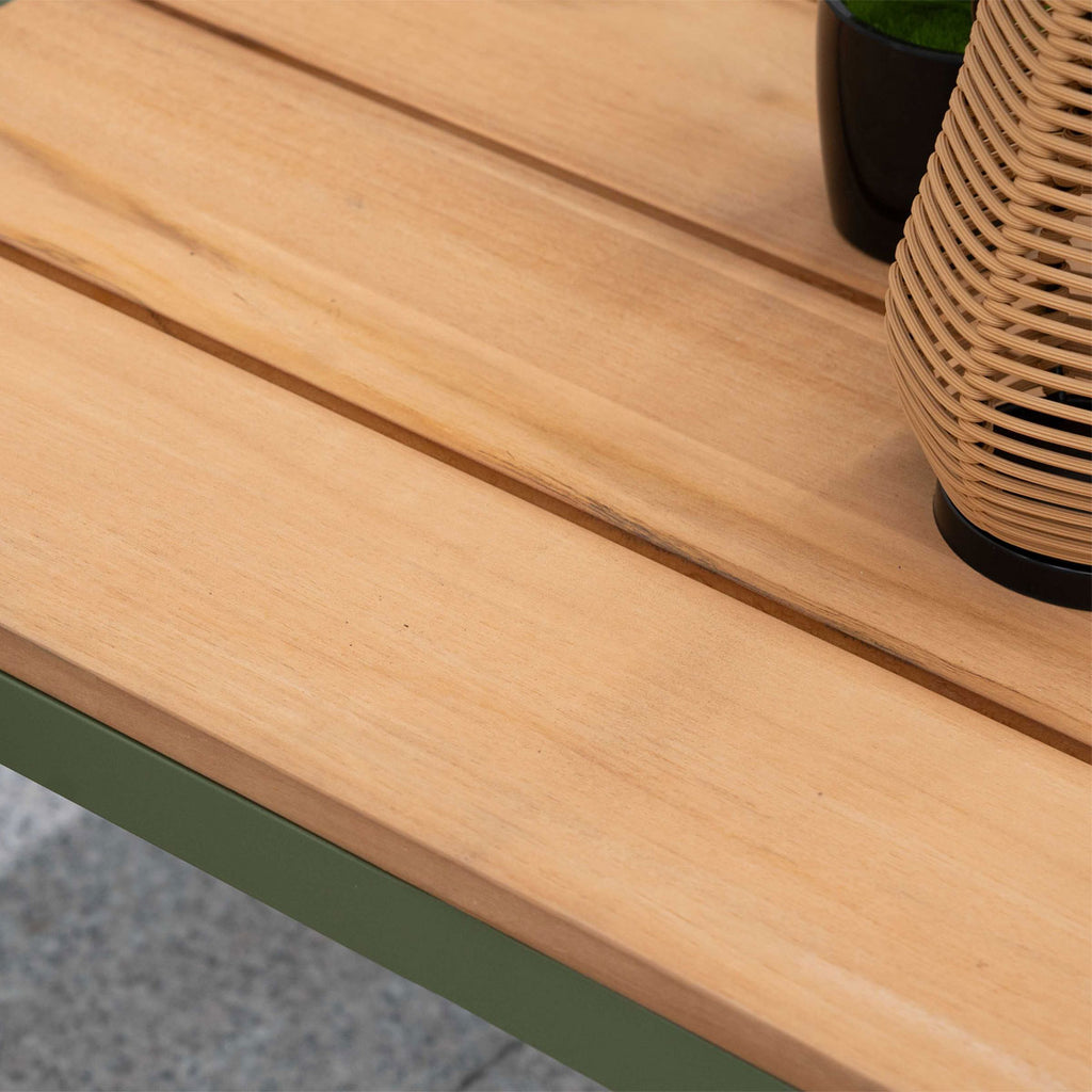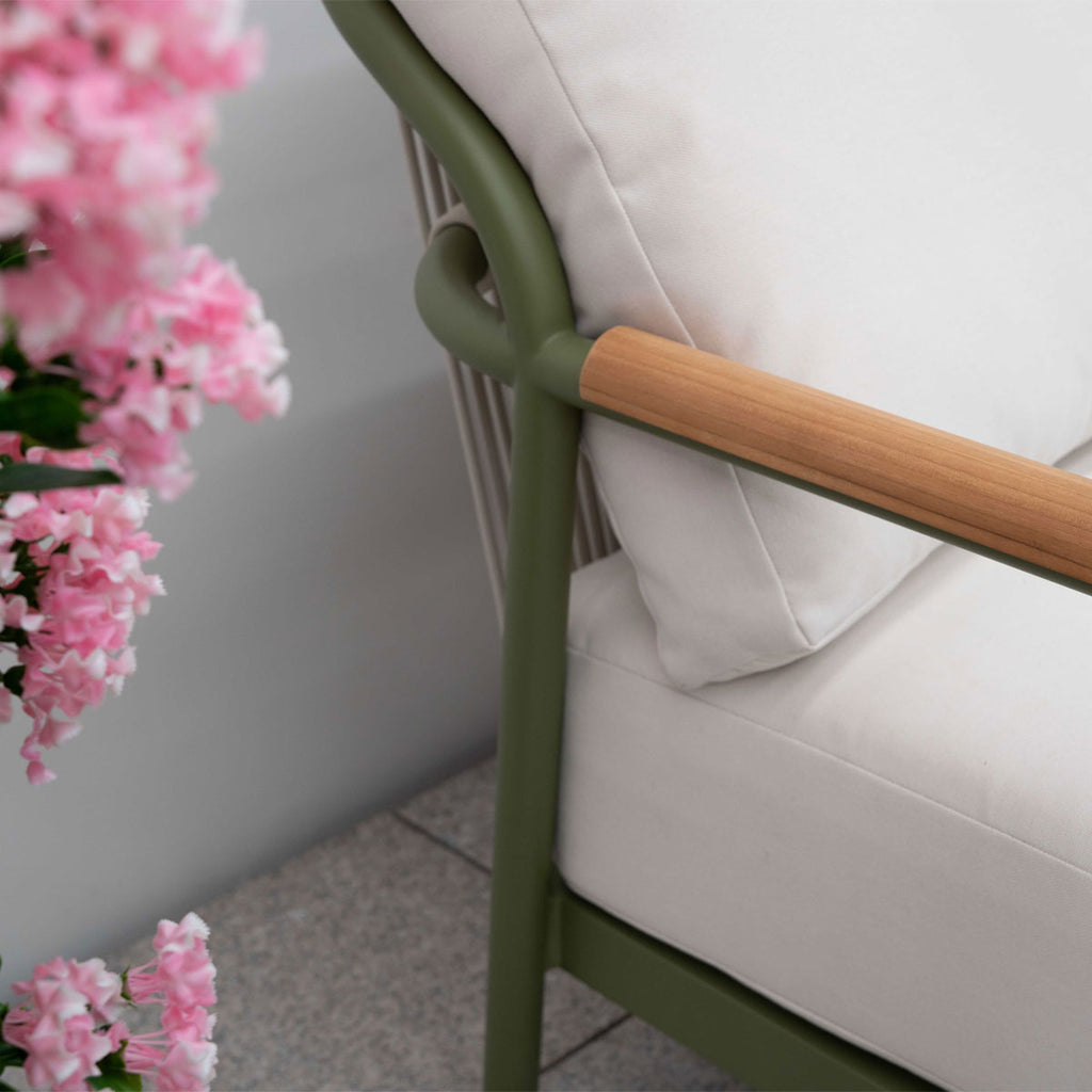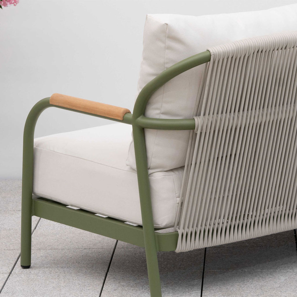 Experience luxury and style with the Ashley outdoor dining set The unique rope detail adds a touch of elegance while the green frame seamlessly blends with your outdoor space. The cream cushions provide comfort while enjoying the great outdoors. Upgrade your patio experience today.