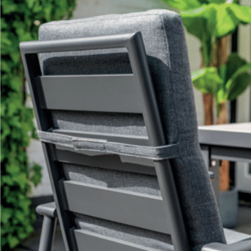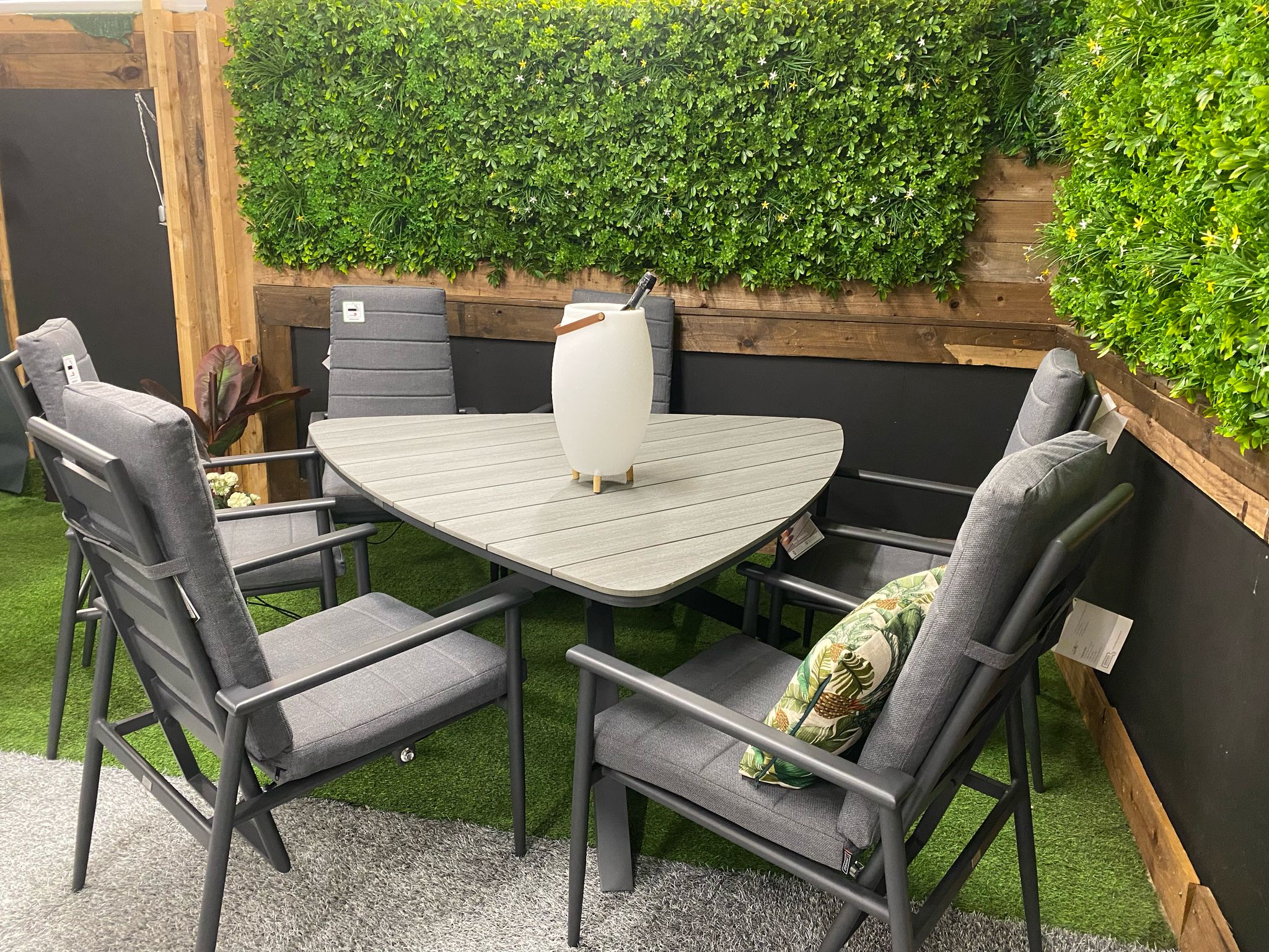 Upgrade your outdoor dining experience with the Edison Triangle Dining Set. The 170cm triangle table, with a carbon black frame and a grey teak Vironwood top, pairs perfectly with the modern reclining Biola dining chairs featuring carbon black frames and mystic grey fabric. Enjoy both style and comfort with this chic set.