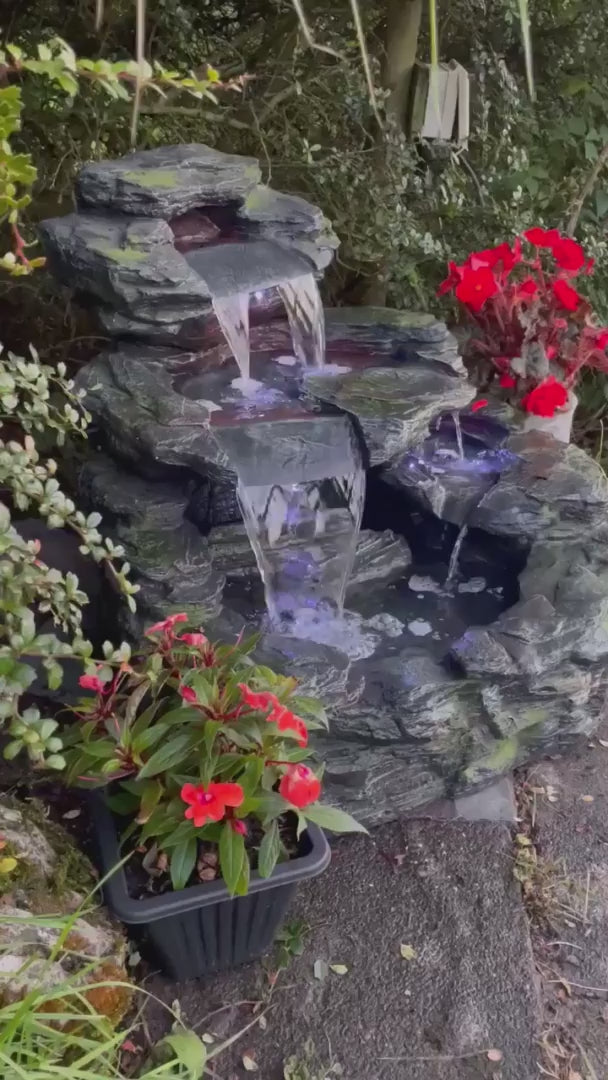With low voltage, inbuilt LED lights this water feature can be admired at any time of day or night.