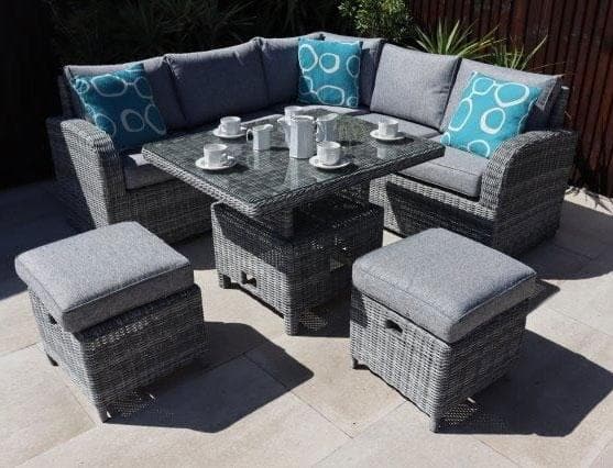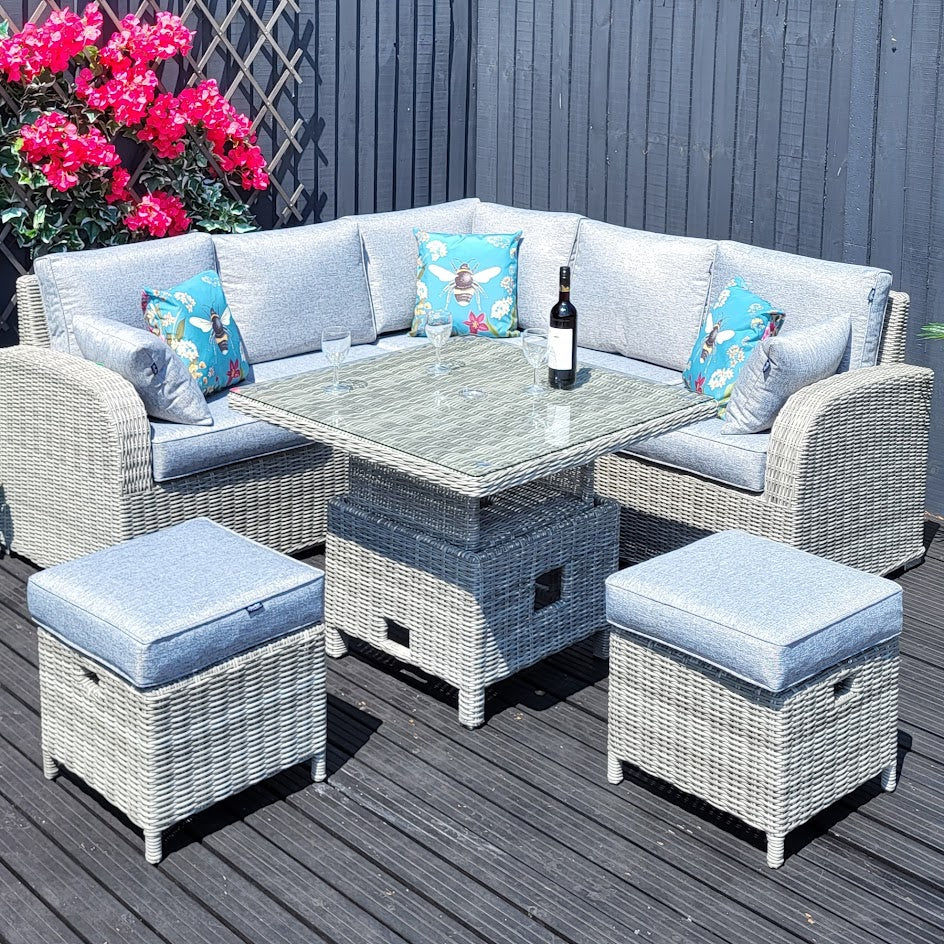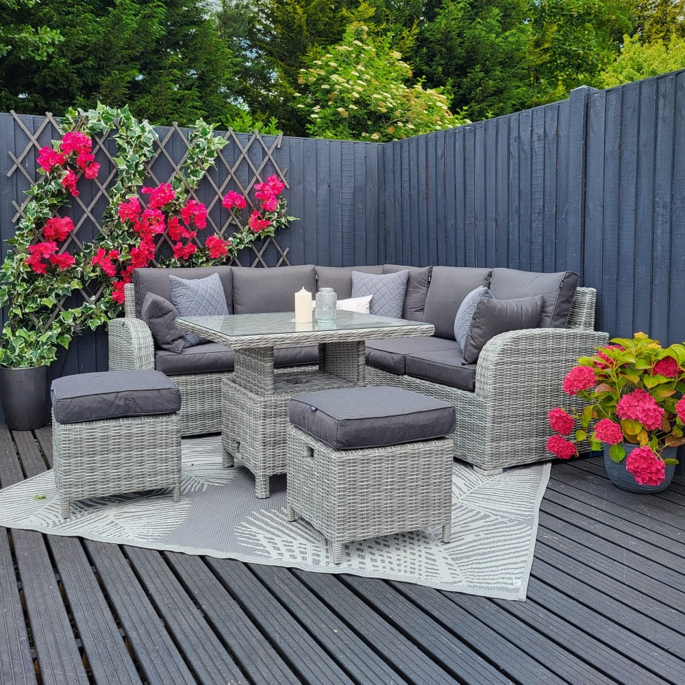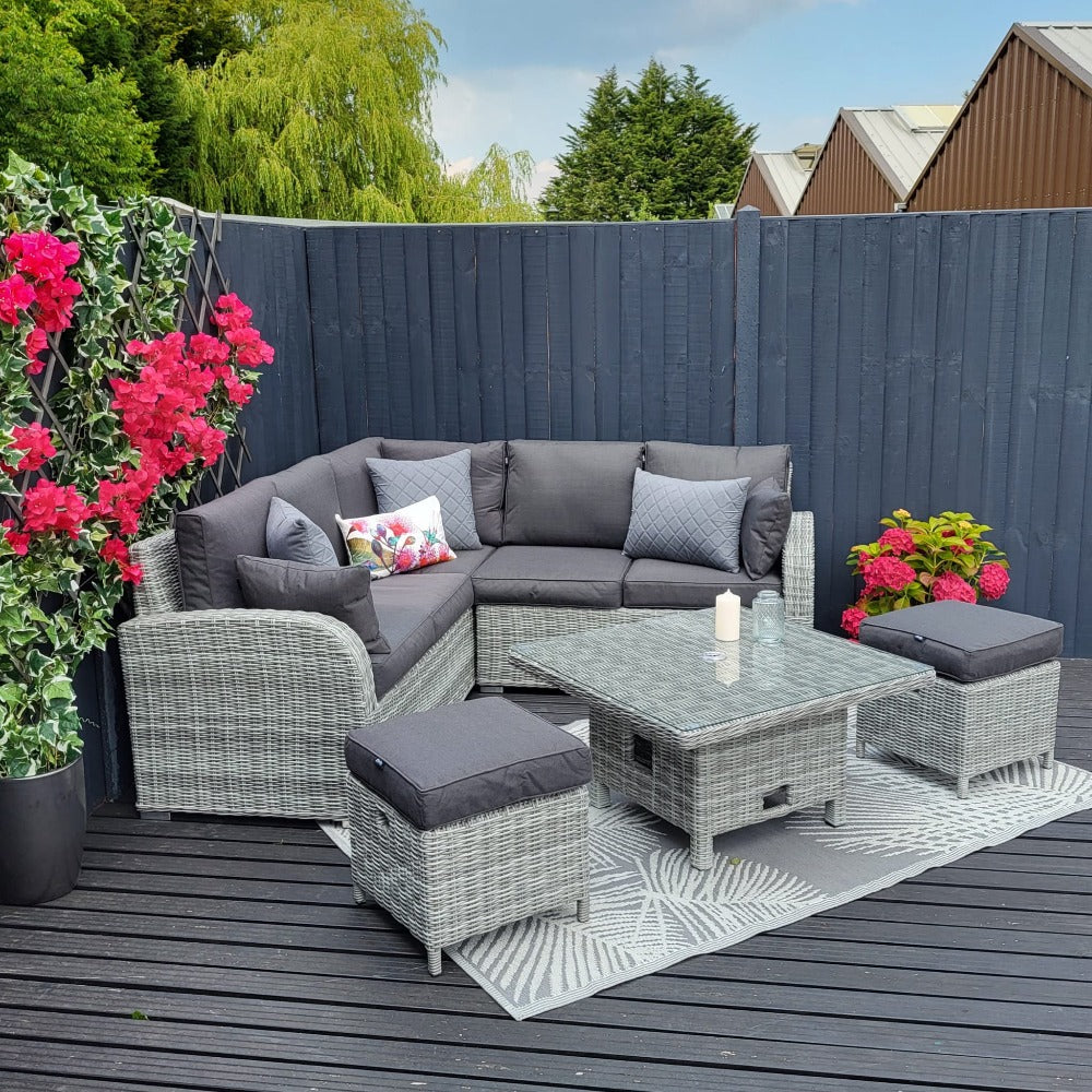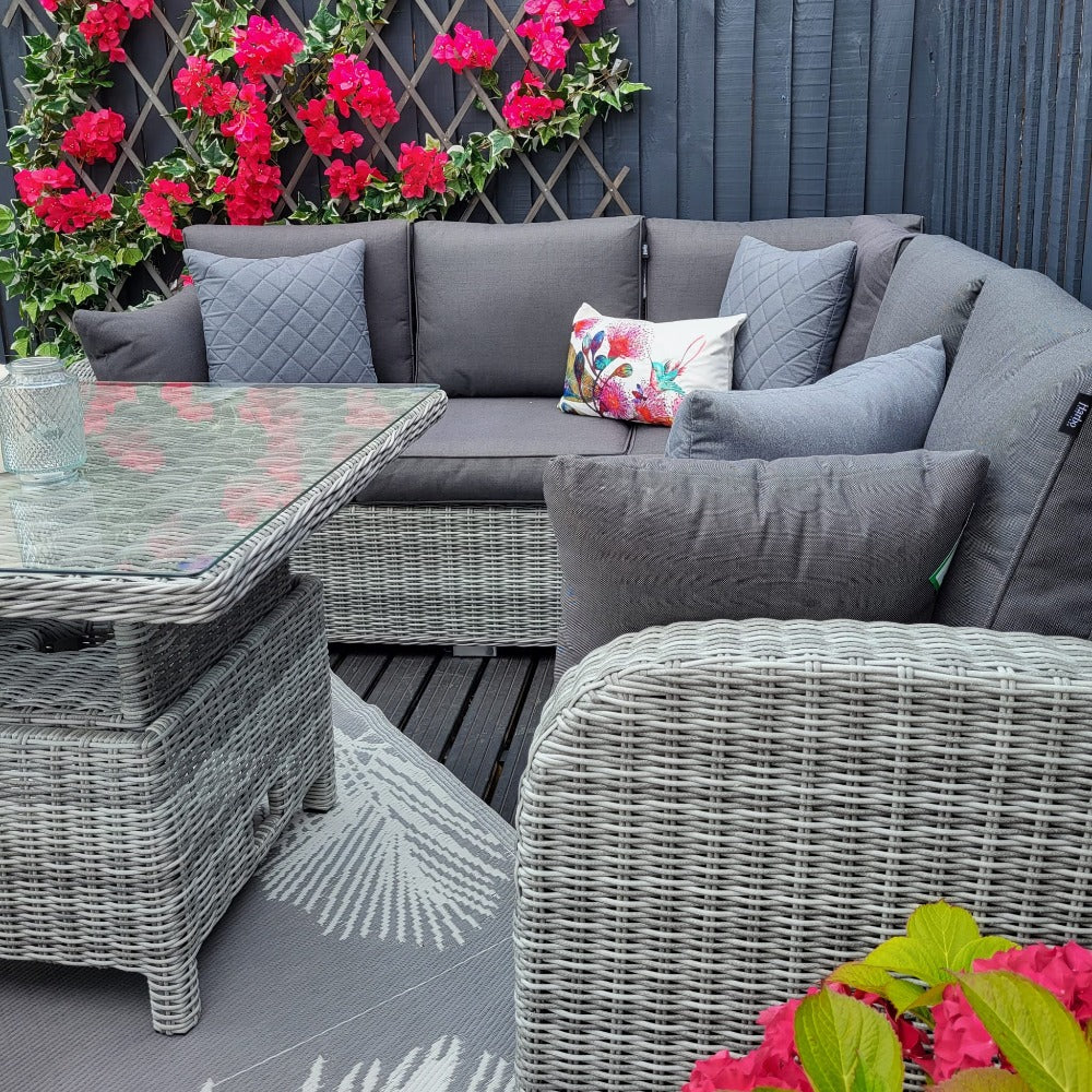 The Harbo Club Compact Garden Corner Set with Height Adjustable Table is perfect if you are working with a smaller garden space or wanting something for your holiday home. Seats up to 6 people, making the corner set practical as well as being super comfy and stylish.
