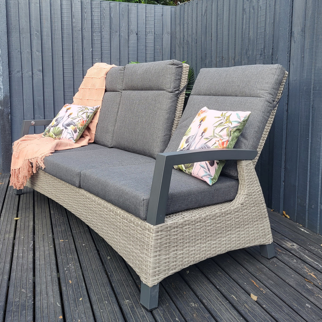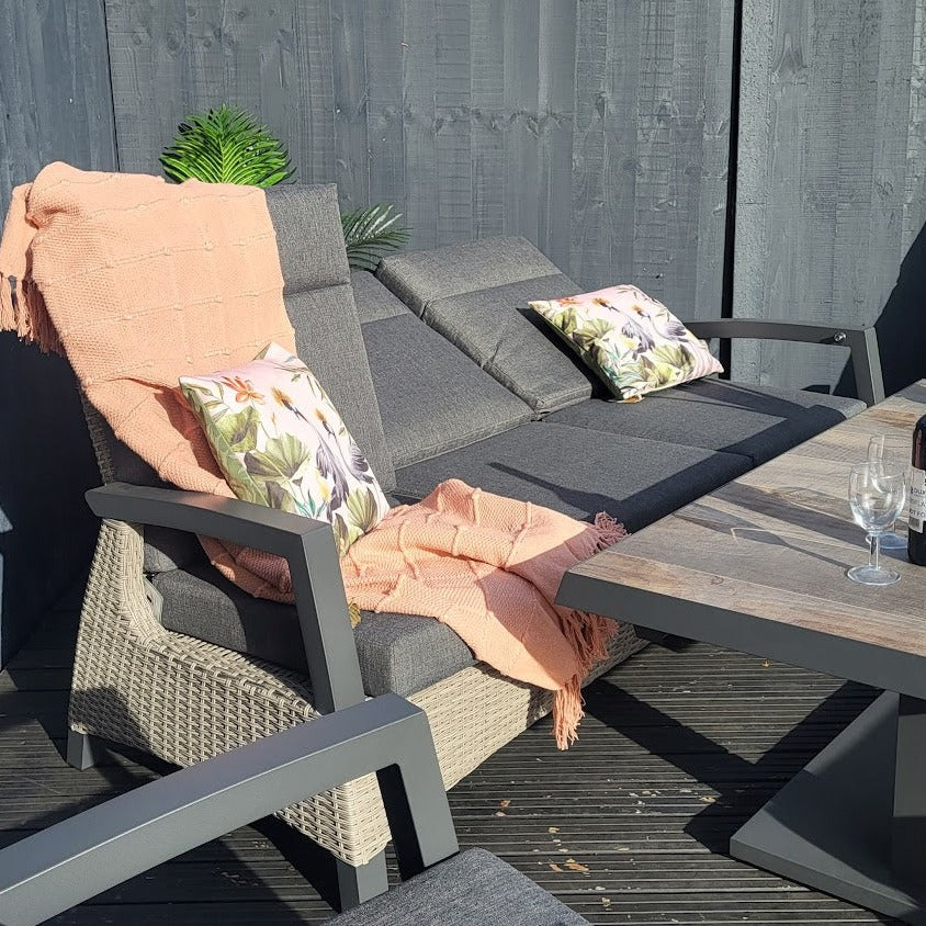This innovative design seamlessly combines traditional and modern elements. With automatic gas lifts, this reclining chair require minimal effort from the user. Crafted with durable double half-round rattan and high-grade Aluminium frames, this high-quality collection also includes all weather cushions in resilient fabrics.