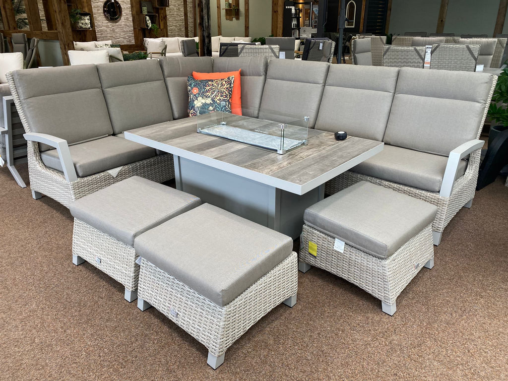 Premium in garden furniture. The Kendal high backed large corner dining set is one of our top investment sets. New this year with an integrated firepit.