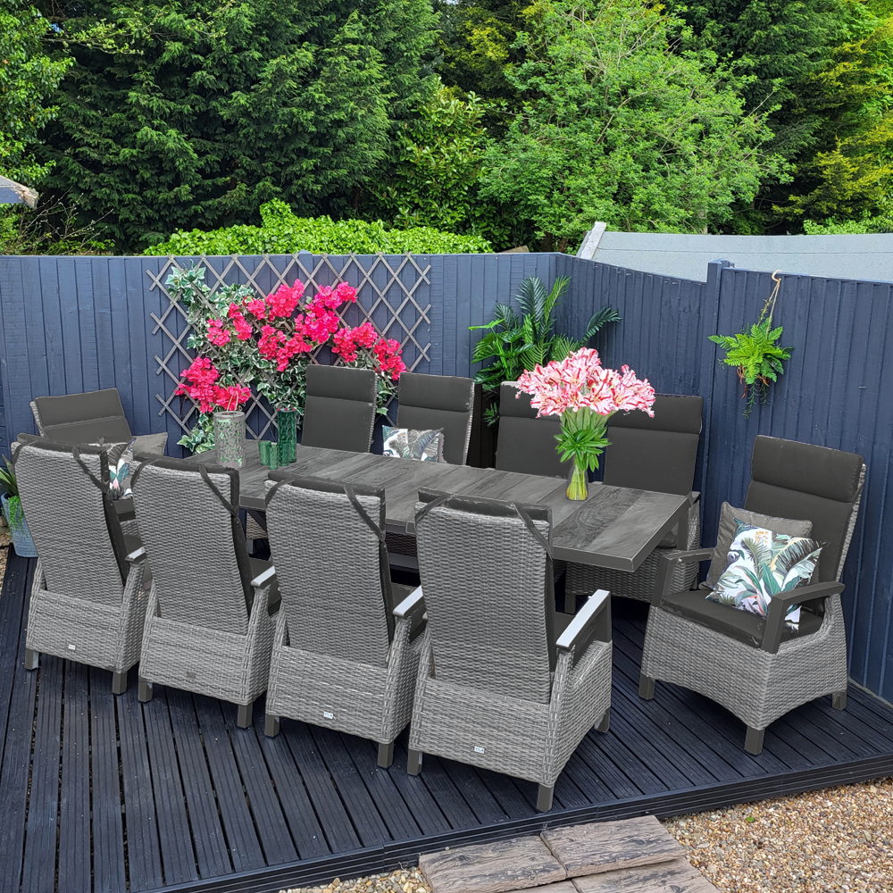 This versatile Kendal 8 to 10 seat dining set is perfect for large families. Extend the luxury dining table to seat 10.