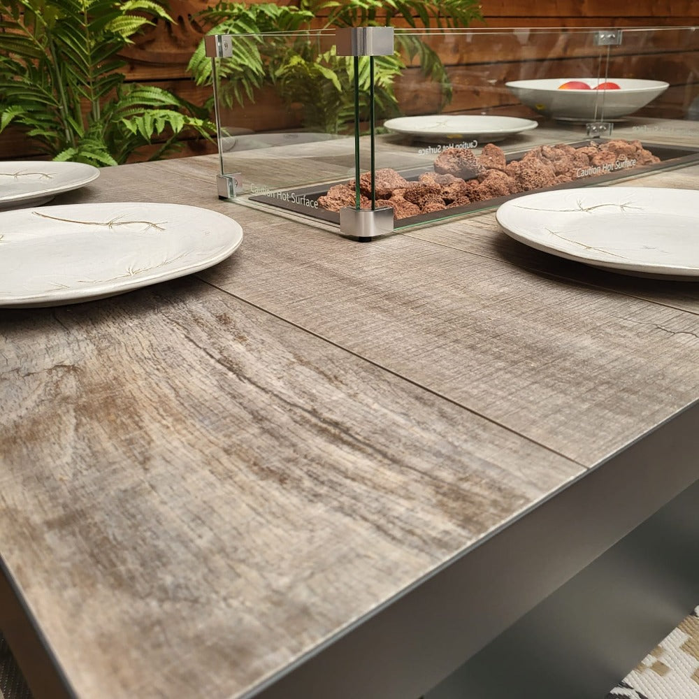 The Vila Triton Garden Sofa Set with Gas Firepit Table has a robust aluminium frame which is extra-thick for a longer lifespan without fear of rusting. Its 3-Seater Sofa, 2 Seater Sofa and 2 Armchairs are adjustable to provide comfortable seating for up to 7 people. The cushions are hard-wearing and effortless to maintain, while the ceramic table-top of the fire-pit table is both scratch-resistant and easy to clean. Ignite the gas fire-pit with the push of a button and enjoy the warmth and glow all year long. This Triton set impresses, with a Coffee Table for drinks and snacks included.