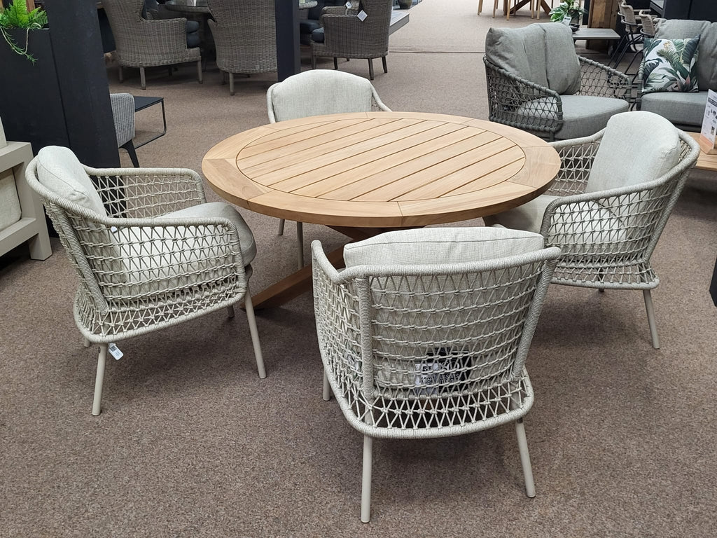 Upgrade your outdoor dining experience with the Puccini 4 Seat outdoor Dining from 4 Seasons Outdoor. Featuring stylish Puccini chairs in a latte-coloured design, featured prominently in both the frame and cushions, complemented with a striking rope pattern.