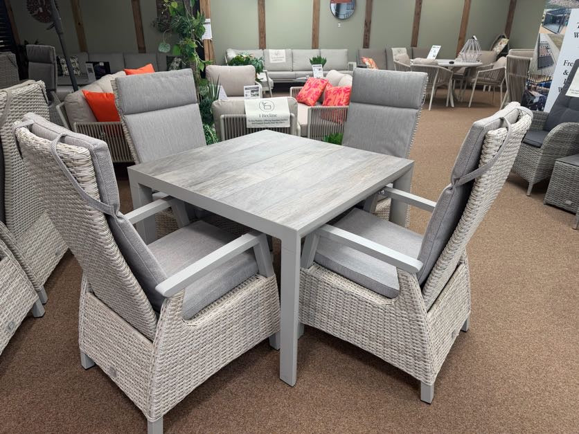 Kendal 4 Seat Reclining Dining Set - Natural is a modern twist on traditional rattan garden furniture. A perfect mix of rattan and aluminium. Perfect for relaxing on the reclining chairs after dining. The dining table has ceramic tile table top as oppose to glass making it scratch resistant.