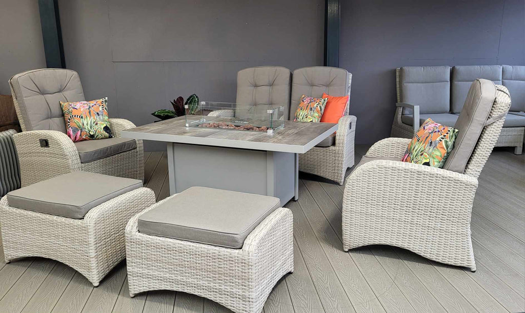 The Bowness Reclining Lounge Set with Firepit Table is a best seller when visiting our showroom, our customers love the fact this set has it all! Relax and dine all in one. The high backed, reclining sofa and chairs are fantastic for relaxing.