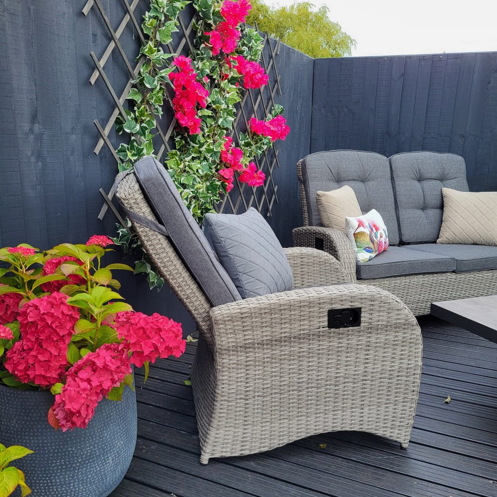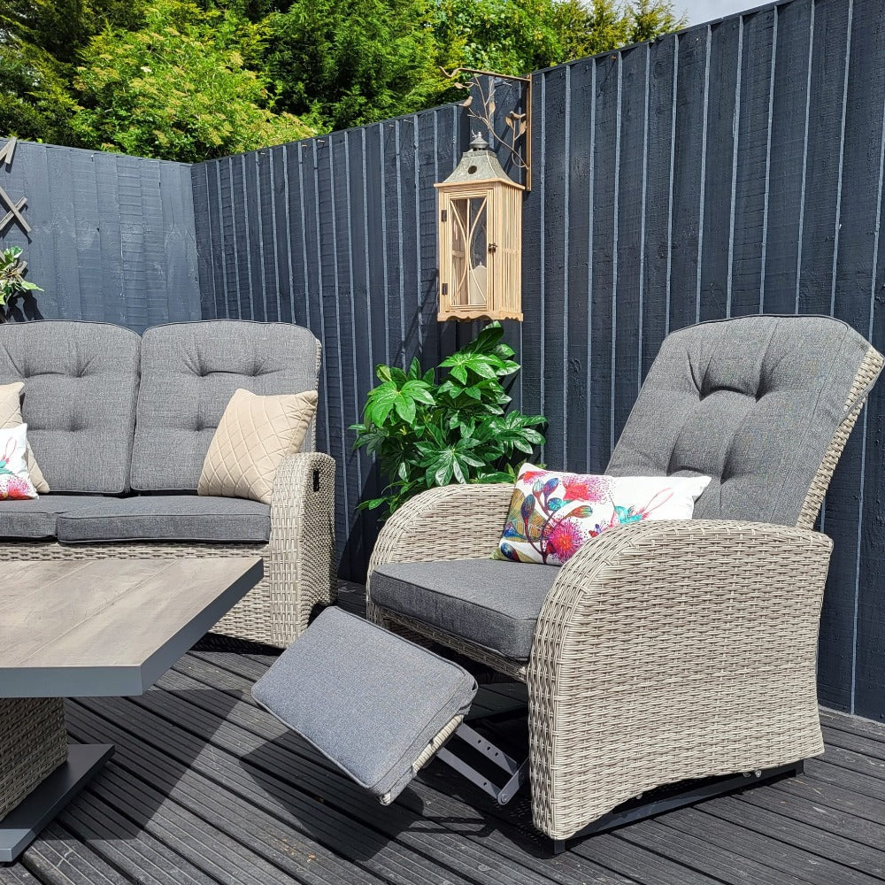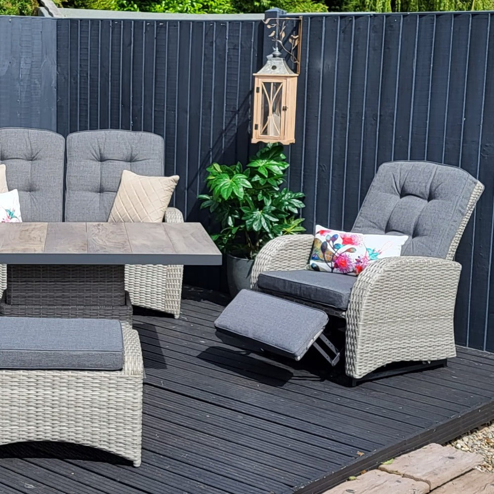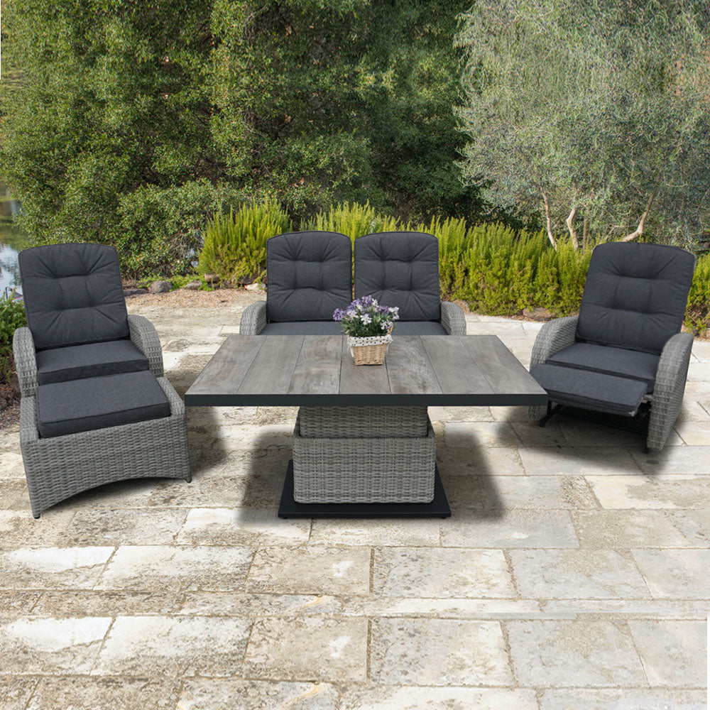 Discover the Bowness Rocking & Reclining Lounge Set with Adjustable Table in Grey by Vila. Ultimately, this is a top pick at Duxburys Garden Furniture and is known for its versatility and comfort. Above all, this set combines relaxation and dining seamlessly for the dream garden gathering experiences.