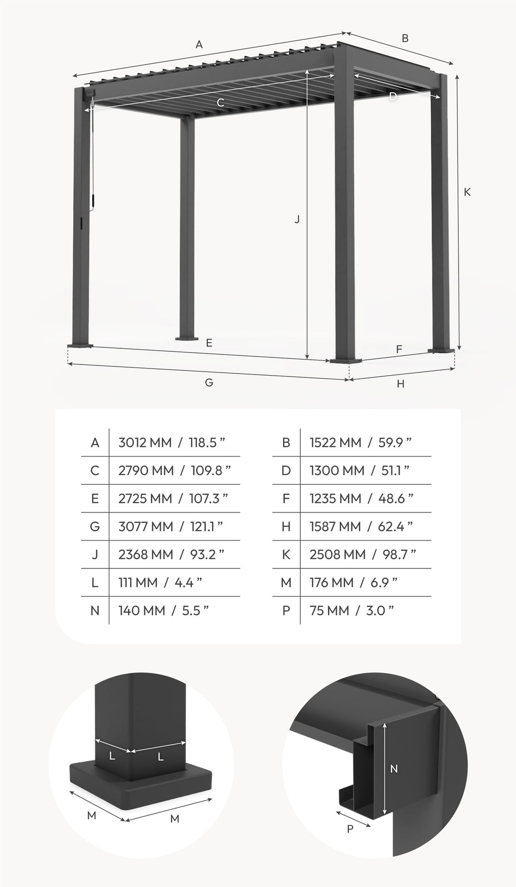 No need to manually remove rainwater. A clever drainage system channels water through the pergola’s frame and down through the legs, keeping your space dry and free from water runoff. Just check the gutters occasionally to remove debris and maintain peak performance.