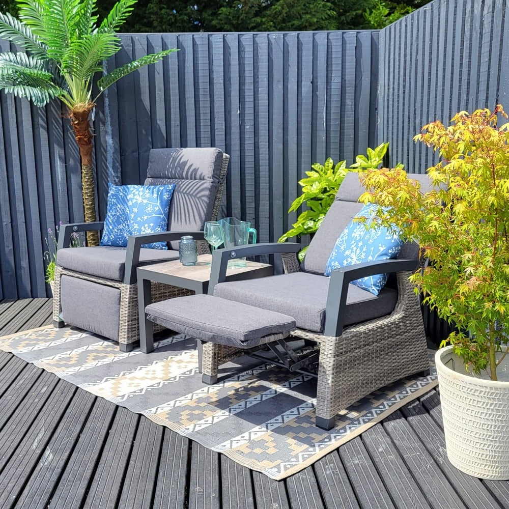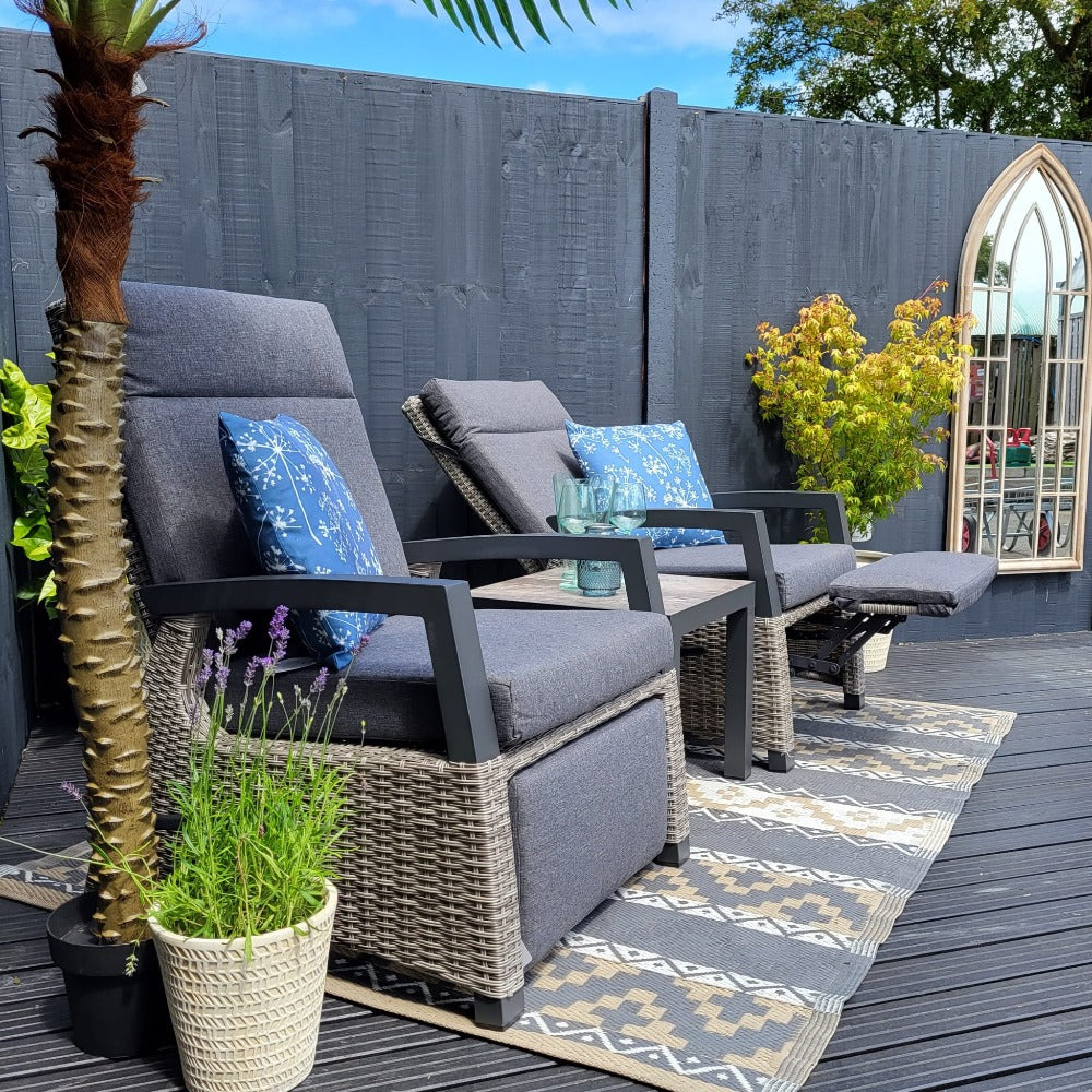 Experience the perfect blend of modern and traditional styles with the Wide Kendal reclining set in Stone Grey and Charcoal. Complete with integrated footstools, this premium rattan garden furniture range offers effortless comfort with automatic gas lifts and deep-padded chair cushions. The double half-round rattan and high-grade aluminium frames provide durability and style for ultimate relaxation.